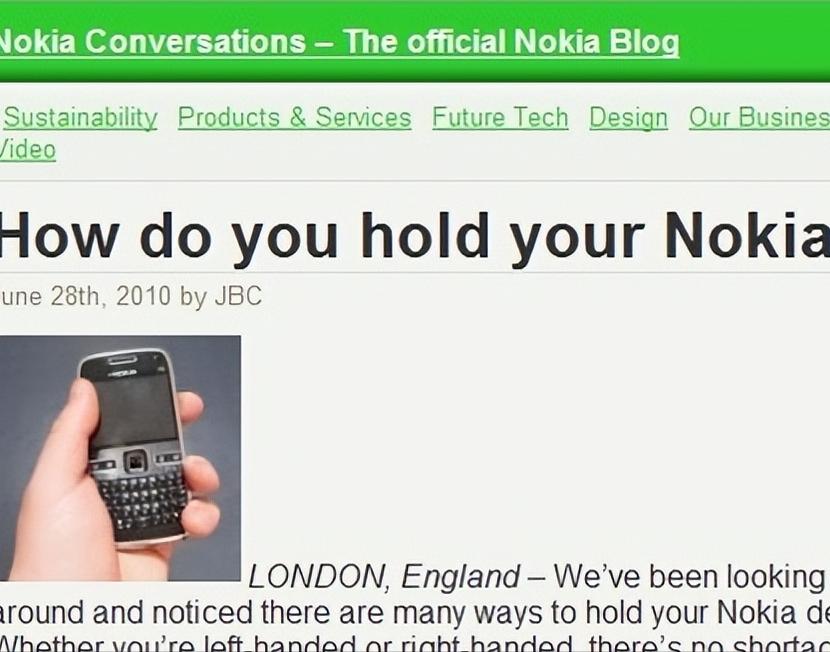 后来跨越时代的iPhone4出现的时候,诺基亚嘲笑iPhone4的信号问题,在其官方博客中发表了一篇名为《你怎样手持诺基亚手机?》的文章。