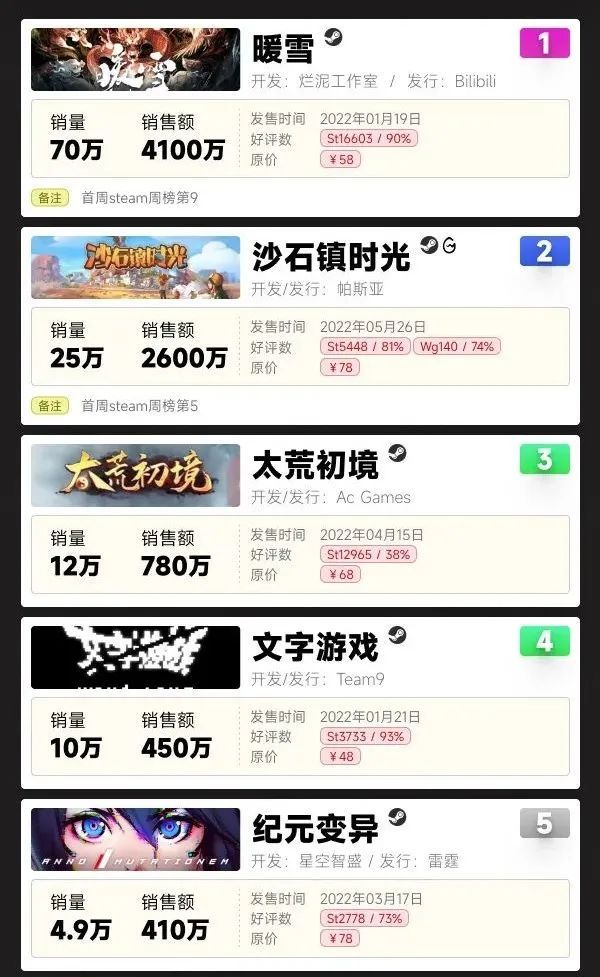 但盛景不常在。7月22日,国游销量榜官方微博发布了《2022年国游销量半年榜》,数据表明,上半年国产买断制新游前十名总销售额为9200万,相较去年同期的3.88亿元下降了76%。榜单显示,2022年上半年能够达到10万份销量级的作品仅有4款,大盘几乎退回了两到三年前的水准。