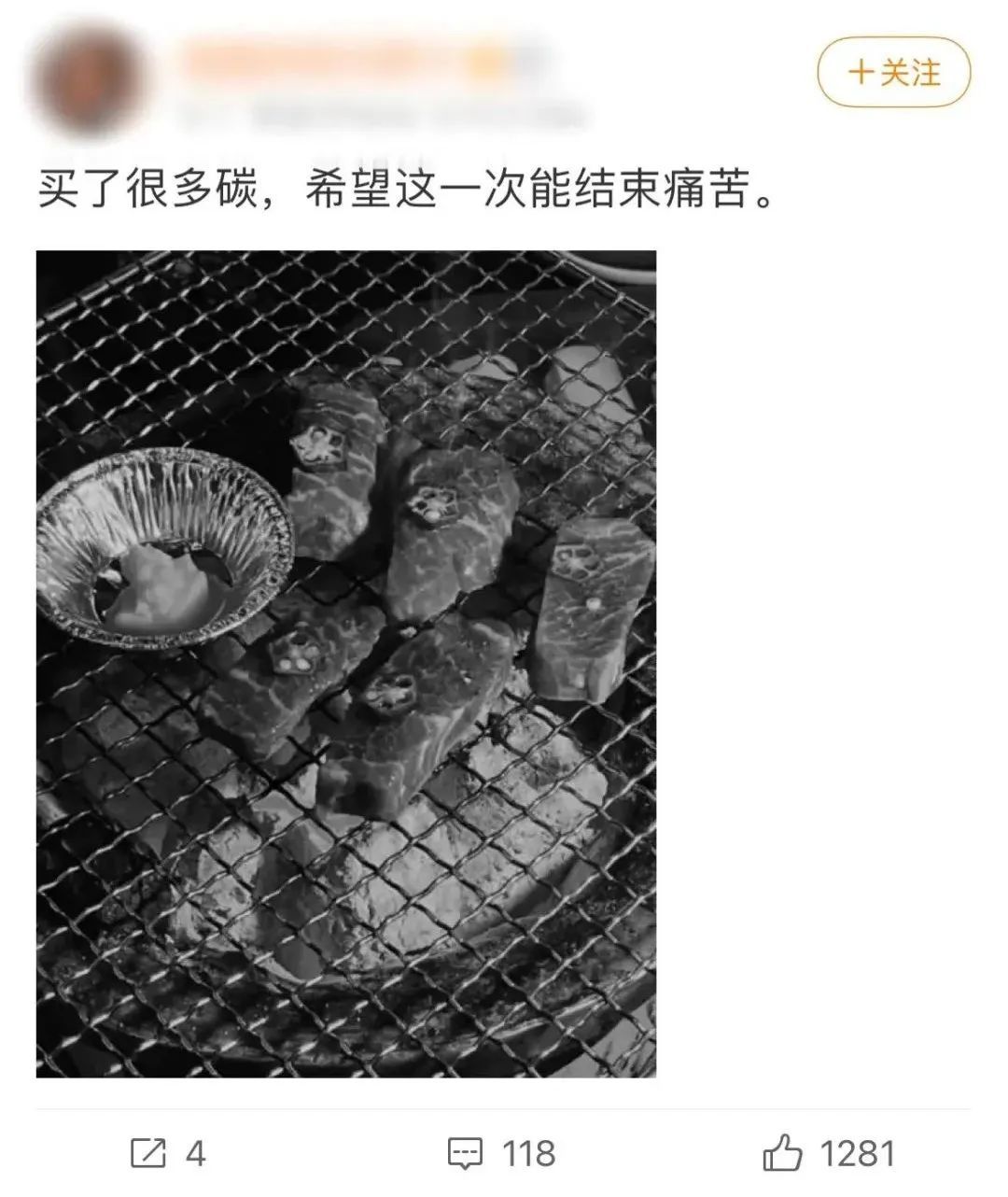 有博主发文:“买了很多炭,希望这一次能结束痛苦。”