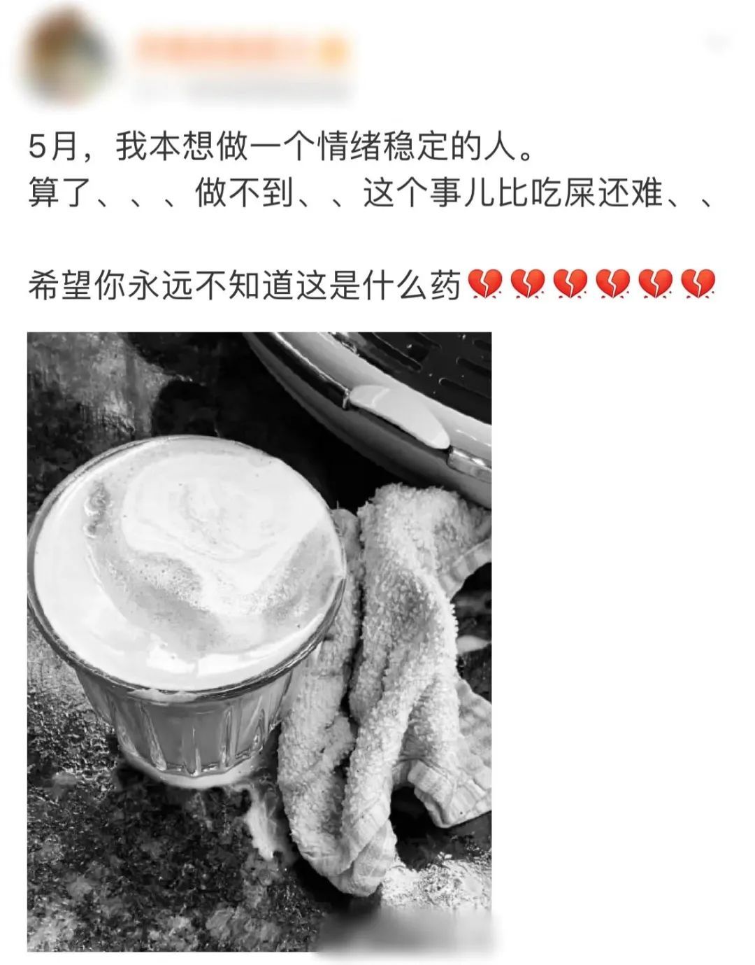“5月,本想做一个情绪稳定的人。希望你们永远不知道这是什么药。”
