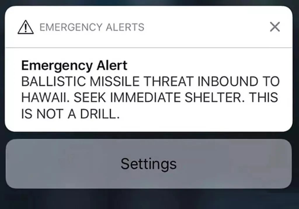 因为警报突然提示,“弹道导弹威胁夏威夷。请立刻避难。这不是演习!”
