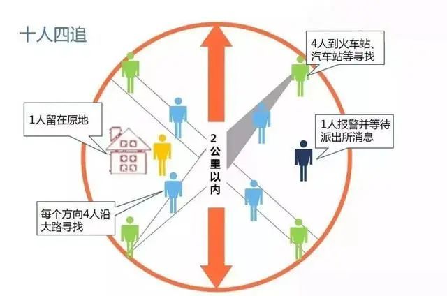 为了增加找回的概率,报警后也可以使用中国公安大学教授王大伟博士发明的“十人四追法”来协助警方寻找孩子: