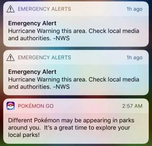 比如2016年佛罗里达州遭遇强烈飓风,警报都是在提醒大家小心躲避,可Pokemon Go却让大家出去抓小精灵……