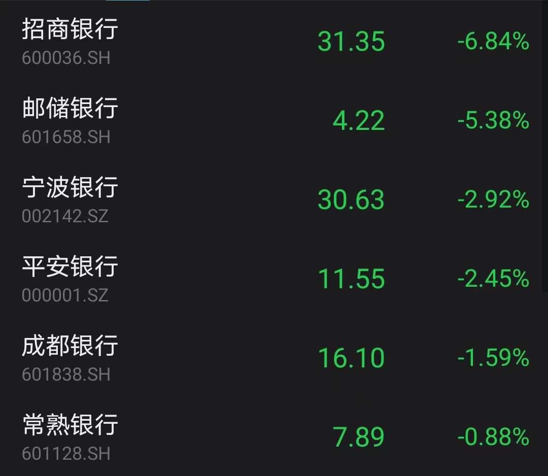 银行股早盘走低,招商银行放量跌近7%,邮储银行跌超5%,宁波银行、平安银行、成都银行等跟跌。