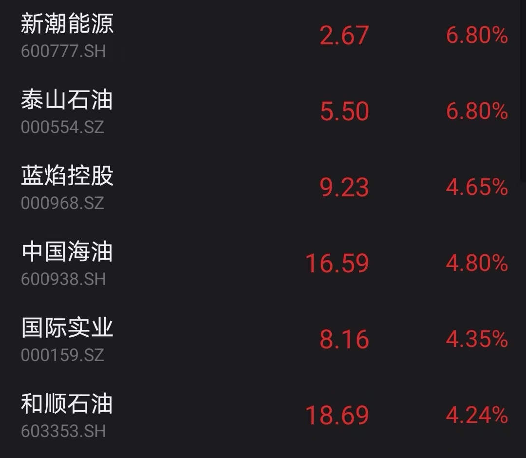 石油板块开盘强势,中曼石油冲击涨停,贝肯能源、通源石油、中海油服、潜能恒信等纷纷走强。消息上,10月3日至10月7日,国际油价实现“五连涨”。OPEC+在10月5日宣布减产决定——自11月起将原油日均产量下调200万桶。