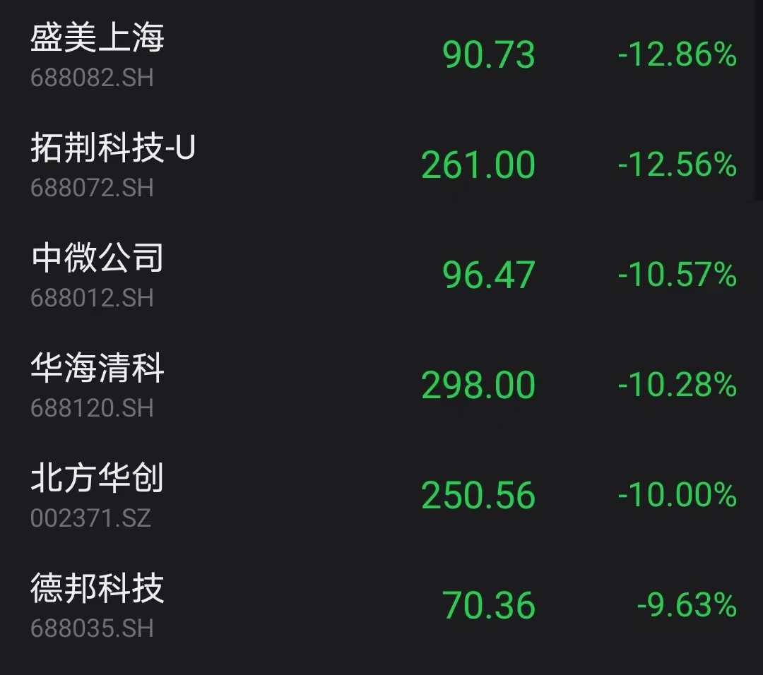半导体芯片股快速走低,海光信息、北方华创跌停,中微半导、拓荆科技跌超10%。