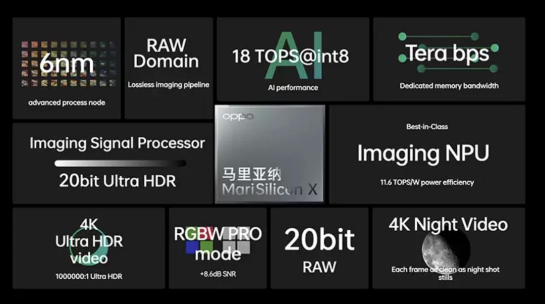 投入是有成效的。2021年OPPO在未来科技大会上,发布了第一颗自研芯片马里亚纳MariSilicon X。这款芯片采用台积电6nm工艺,是一颗PU芯片,主要用于影像方面,是全球首个移动端6nm影像专用NPU。