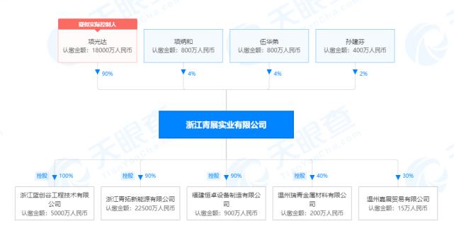 天眼查数据显示,浙江青展的股权结构是项光达持股90%、项炳和持股4%、伍华弟持股4%、孙建芬持股2%。
