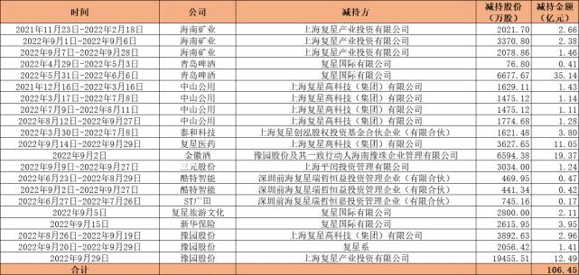 据时代财经不完全统计,除去海南矿业之外,“复星系”本轮减持还包括青岛啤酒股份(00168.HK)、中山公用(000685.SZ)、泰和科技(300801.SZ)、复星医药、金徽酒(603919.SH)、三元股份(600429.SH)、酷特智能(300840.SZ)、ST广田(002482.SZ)、复星旅游文化(01992.HK)、新华保险(601336.SH)、豫园股份等十余家上市公司,约合套现或已超百亿元人民币。