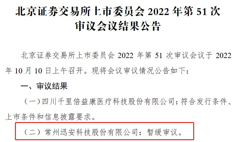 在今日召开的北交所2022年第51次审议会议上,迅安科技(834950)暂缓审议。