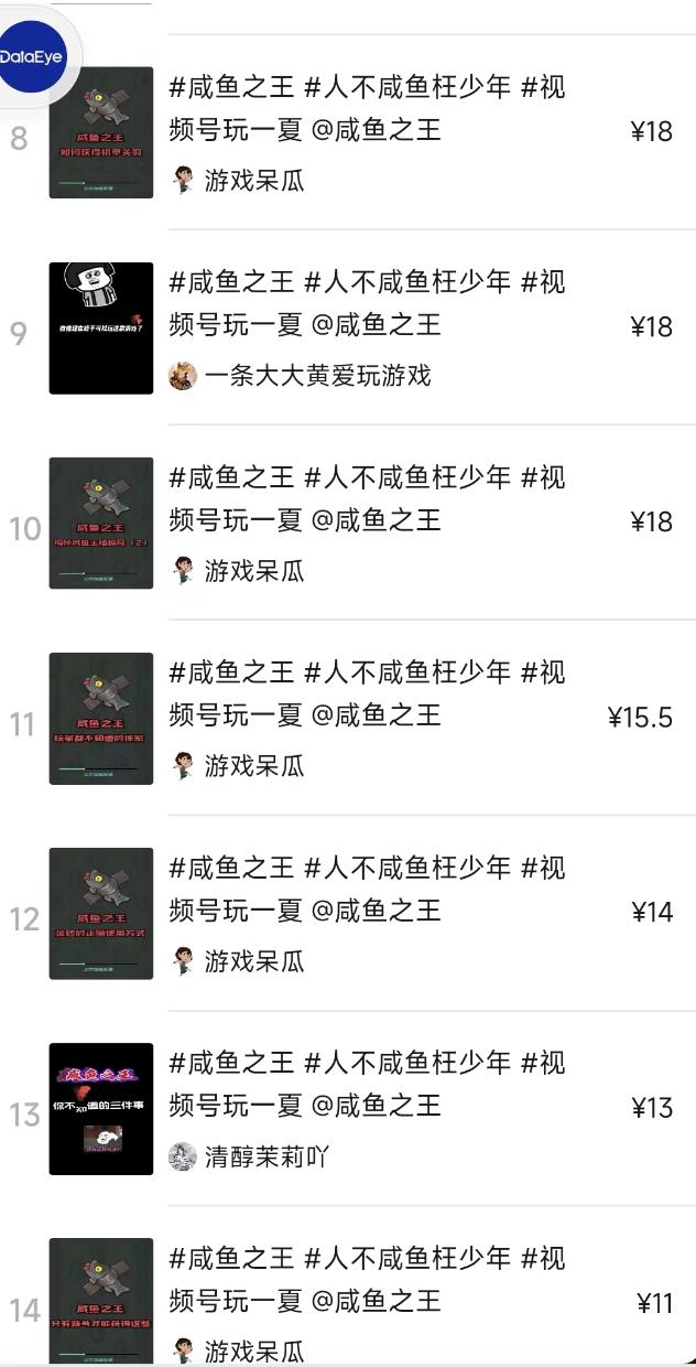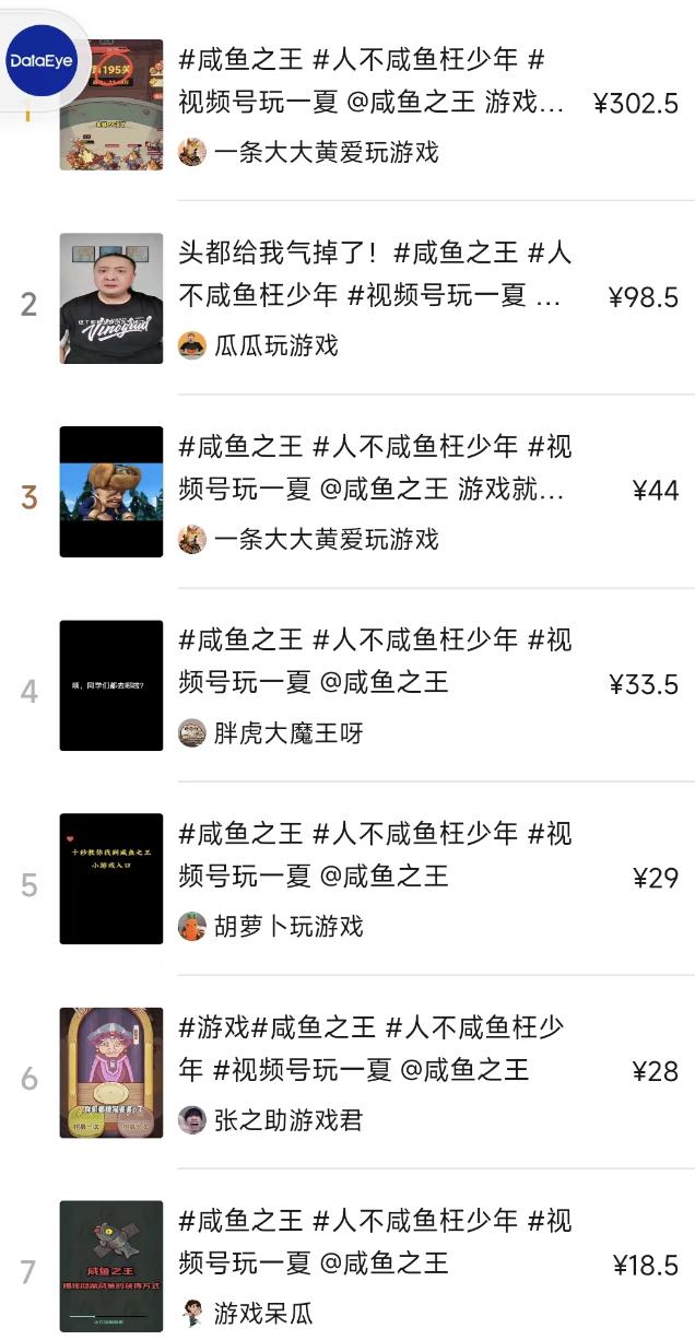 DataEye研究院发现,《咸鱼之王》曾在视频号上线“发视频赢奖金”活动,吸引达人创作出278组视频。