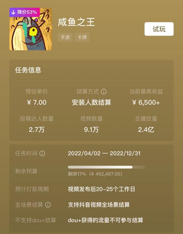 而据“抖音x星途发行人计划”显示,《咸鱼之王》于今年4月入局发行人计划,至今已经吸引超2.7万名达人创作出超9.1万组视频,总播放量目前已经达到2.4亿次。