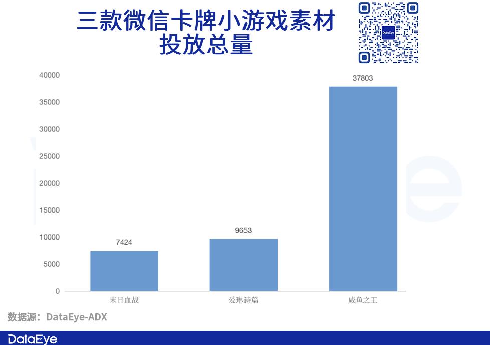 从全周期素材投放量来看,《咸鱼之王》、《末日血战》、《爱琳诗篇》是目前小游戏平台投放较多的三款卡牌产品。其中,《咸鱼之王》从2021年10月底至今,总投放量超过的3.7万组。