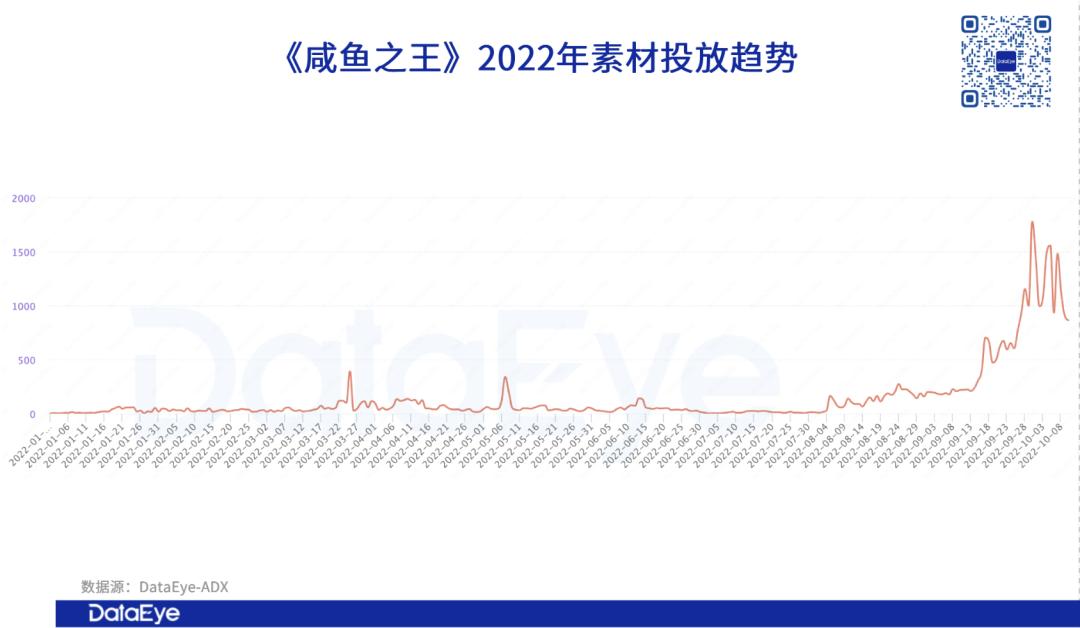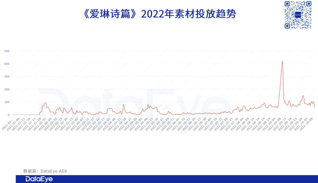 《爱琳诗篇》也同样自今年7月初开始,加大了素材投放量级,并在9月初迎来单日投放量巅峰。