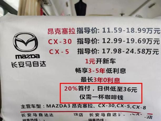 广告语没介绍车的性能,只说便宜,“20%首付,日供低至36元”,更吸引人的是后面的比喻,“仅需一杯咖啡钱”。