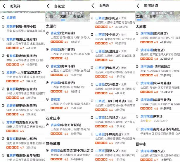 这类餐厅并非是小门小户的餐厅,而是在山西本土比较知名的小型连锁。龙聚祥、杏花堂、山西派、滨河味道……每个品牌大概都有十家左右的门店。