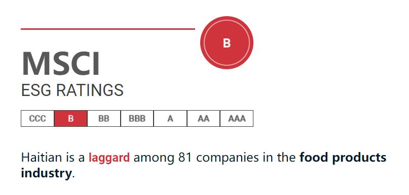 MSCI给海天味业的ESG评级是的B级,属于倒数第二低的等级。