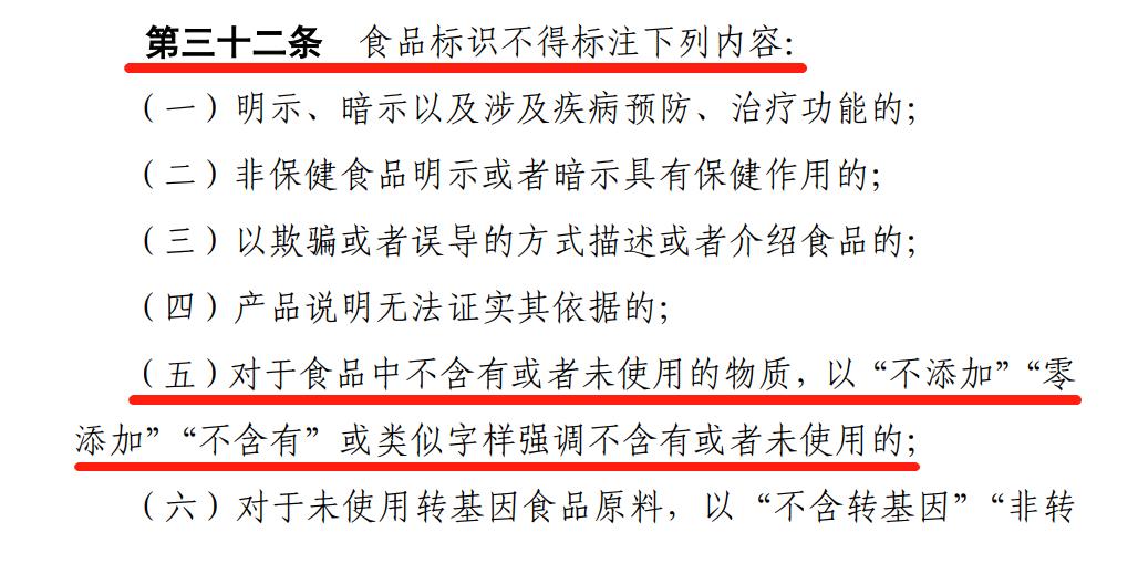 另外,国家监管机构预计近期会推出新的《食品标识监督管理办法》(目前只是征求意见稿)。该文件(征求意见稿)的第32条显示,食品标识不得以“零添加”标注产品中未添加的成分。