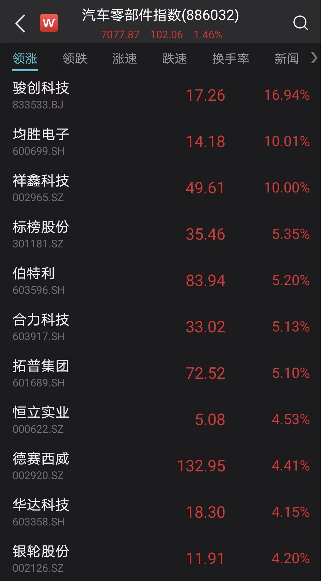 汽车零部件板块震荡走高,均胜电子、祥鑫科技涨停,骏创科技涨超17%,标榜股份、伯特利、拓普集团、合力科技、金鸿顺、德赛西威等多股涨超5%。消息面上,均胜电子预计前三季度净利润为1.15亿元至1.3亿元,同比增长534%至617%;祥鑫科技预计前三季度净利润为1.6亿元至1.7亿元,同比增长188.87%至206.92%。