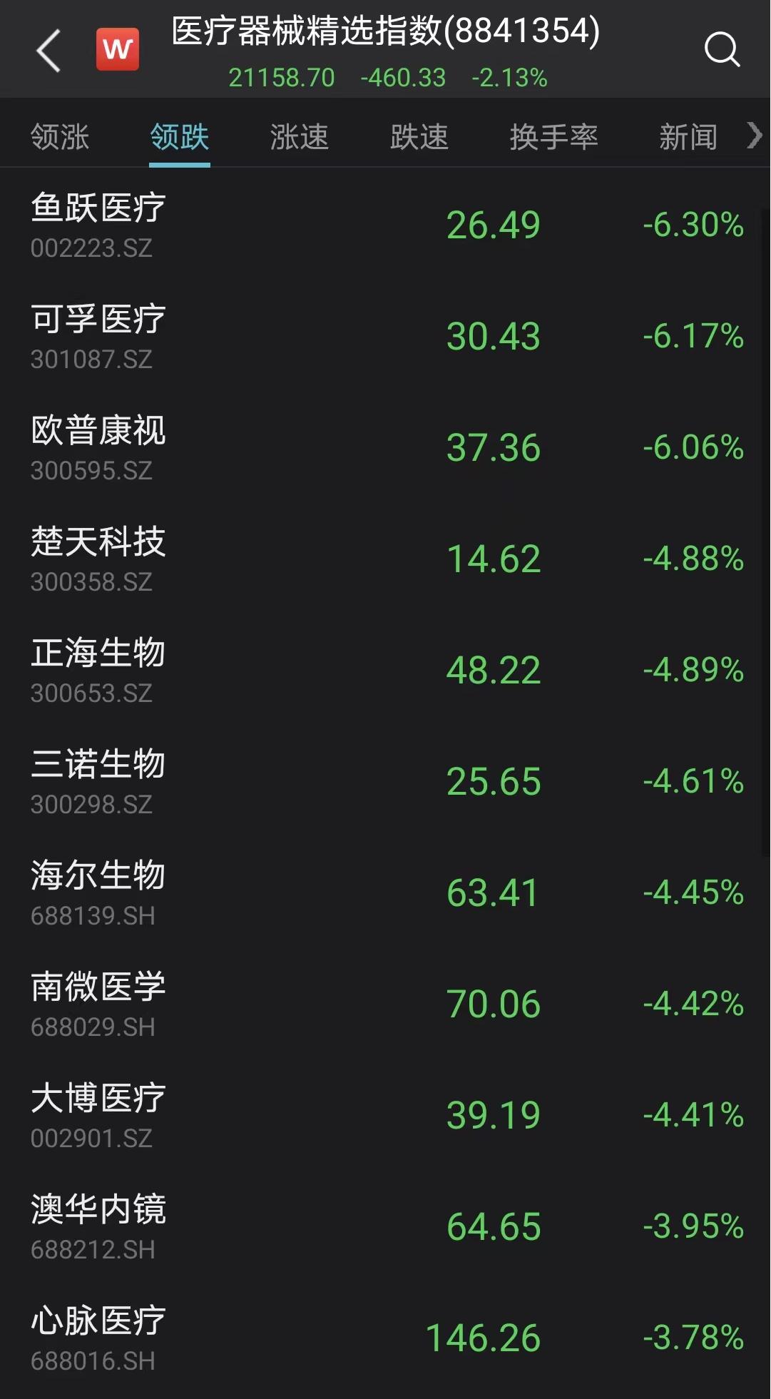 医疗器械板块震荡走低,东富龙跌超8%,可孚医疗、鱼跃医疗、正海生物、三诺生物、尚荣医疗等多股跌超4%。
