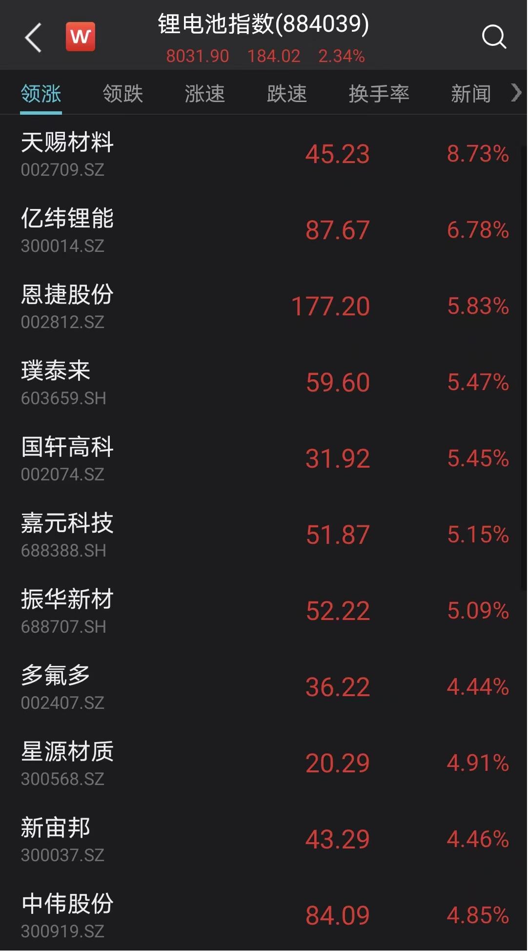 头部公司前三季度业绩大幅增长,带动新能源领域全线走强。锂电股快速拉升,天赐材料涨停,亿纬锂能涨超7%,宁德时代涨近5%,国轩高科、恩捷股份、美联新材、多氟多等纷纷冲高。