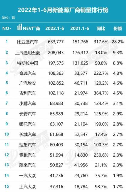 2022年1-6月,吉利新能源汽车销量达10.2万辆。虽然排名第6,较第一名比亚迪的63万辆相去甚远,但却追平了自己2021年的总销量,甚至364.7%的同比增速也冠绝榜单。