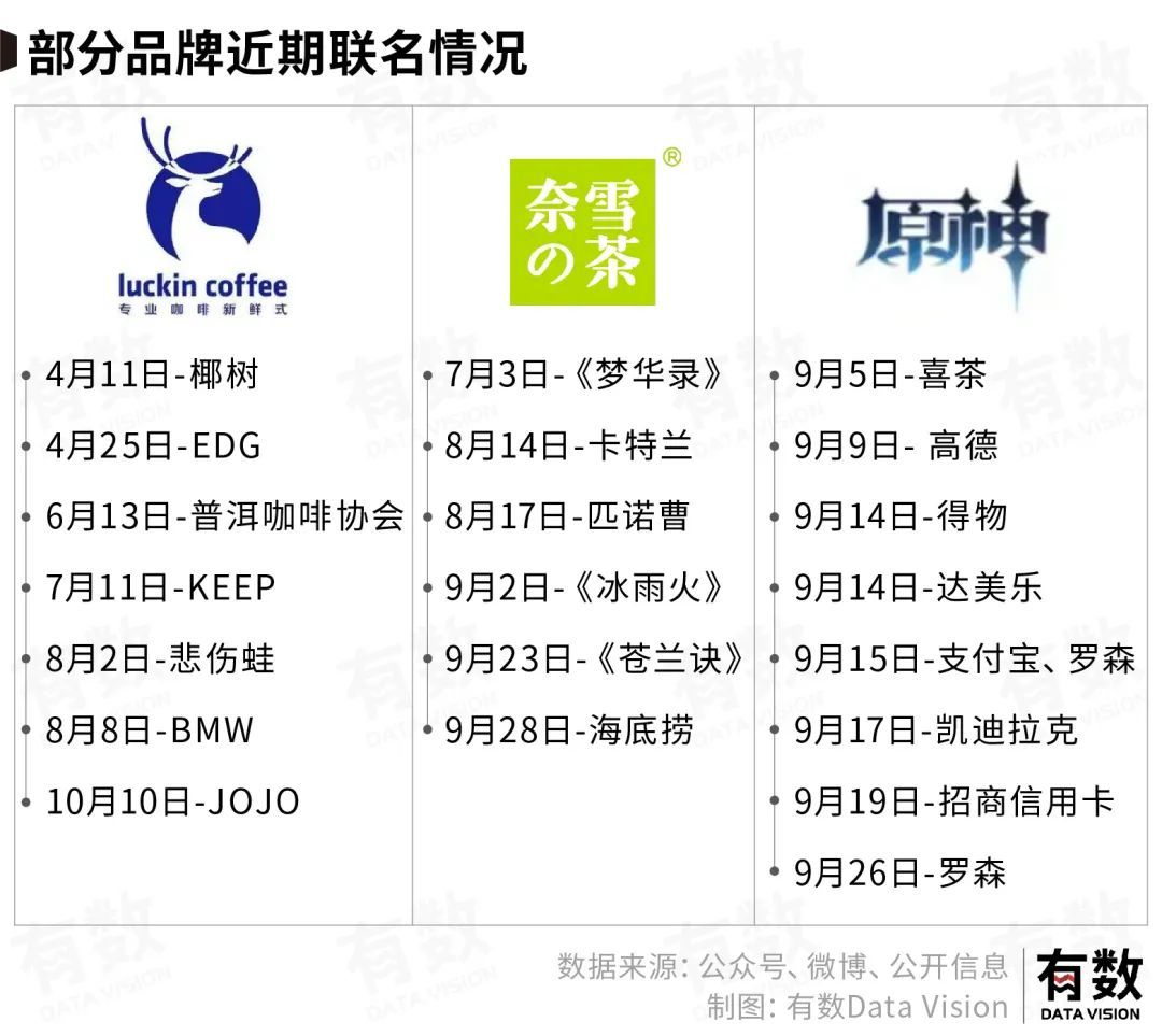 永璞咖啡堪称联名界交际花,拿下过400+次联名,一周可以换好几次CP[8];不轻易下凡的原神,也耐不住寂寞了,仅九月里就联名了近10次,而去年同期官宣的联名仅有一次;就连特斯拉也要和Manner一起卖个咖啡。[1]