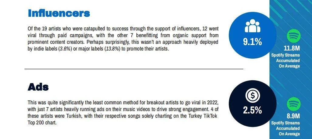 通过对今年上半年20个国家TikTok每周排行榜的研究,ContraBrand发现,登上TikTok Top200并最终在Spotify上一炮而红的歌曲和艺人中,三分之二的歌曲营销都绕开了各类网红和广告流量投放。