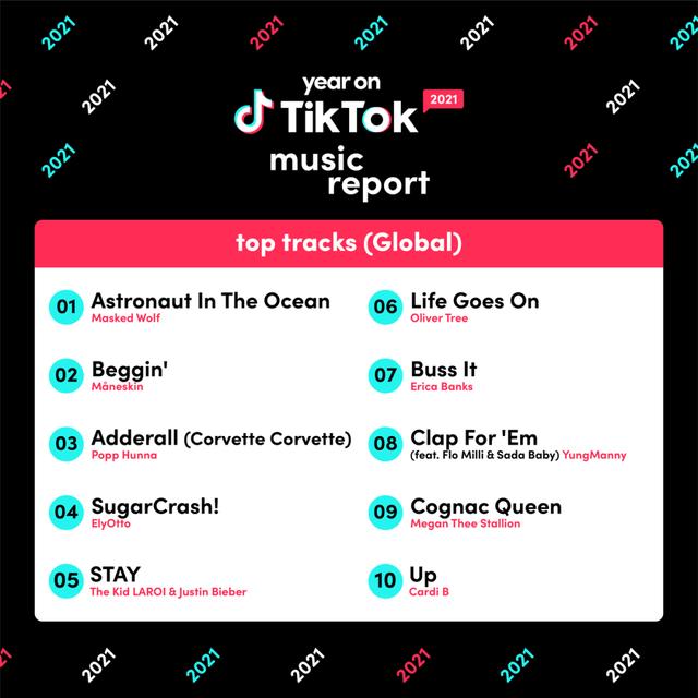 据《2021TikTok年度音乐报告》,仅2021年就有大约430首歌曲的TikTok视频播放量超过10亿,比2020年增长三倍。其中,澳洲说唱歌手Masked Wolf的《Astronaut In The Ocean》是最热门的一首,累计播放量接近200亿。更广为人知的是,诸如Doja Cat、Lil Nas X都经由TikTok成功跃居一线。