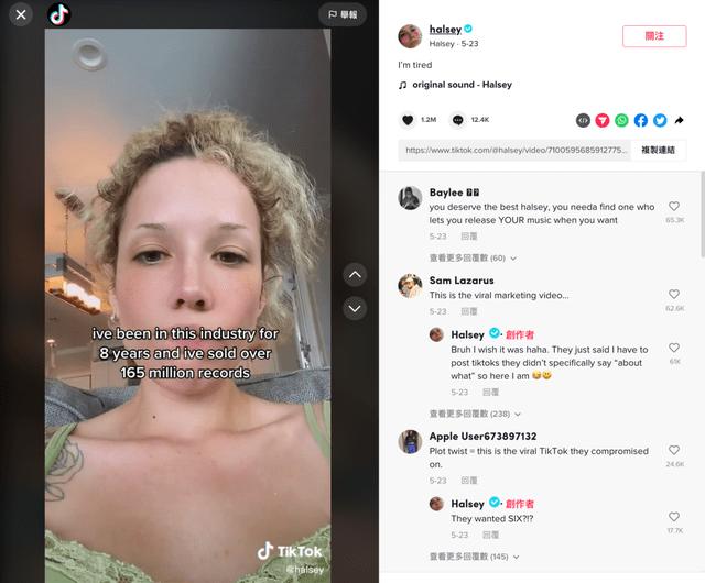 英国女歌手FKA twigs之前就曾表示被唱片公司要求一周发7、8个TikTok视频,没发够,还会被唱片公司以“不够努力”为由警告。同样被TikTok“绑架”的还有美国女歌手Halsey,今年五月她在TikTok上发视频抱怨自己“在音乐行业8年,卖出超过1.67亿张唱片”,却因为等不来一个“TikTok的爆款时刻”,而迟迟不能发布新歌。