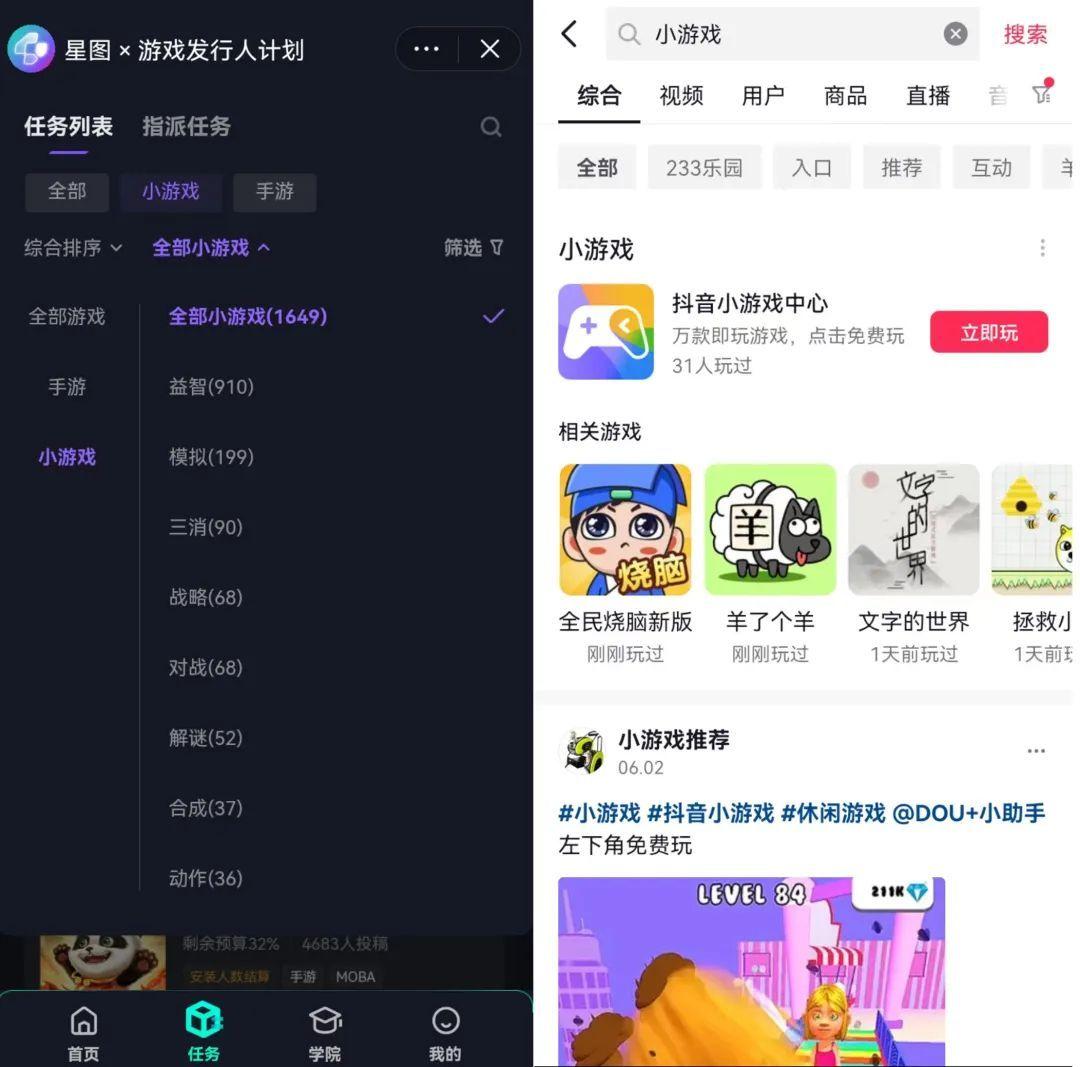 抖音站内游戏内容大肆兴起的一个原因就是游戏推广任务的低门槛性,大多数用户都具备推广游戏的资格,这样一来,用户即是游戏玩家又是游戏推广者,内容传播效果得道保证。这也进一步培养抖音用户的游戏心智,开放小程序游戏端口是抖音游戏至关重要的节点,用户在抖音看游戏、玩游戏、分享游戏、推广游戏等行为闭环,小程序游戏之于抖音是游戏生态闭环的完成,对字节来说是游戏业务发展的新赛程。