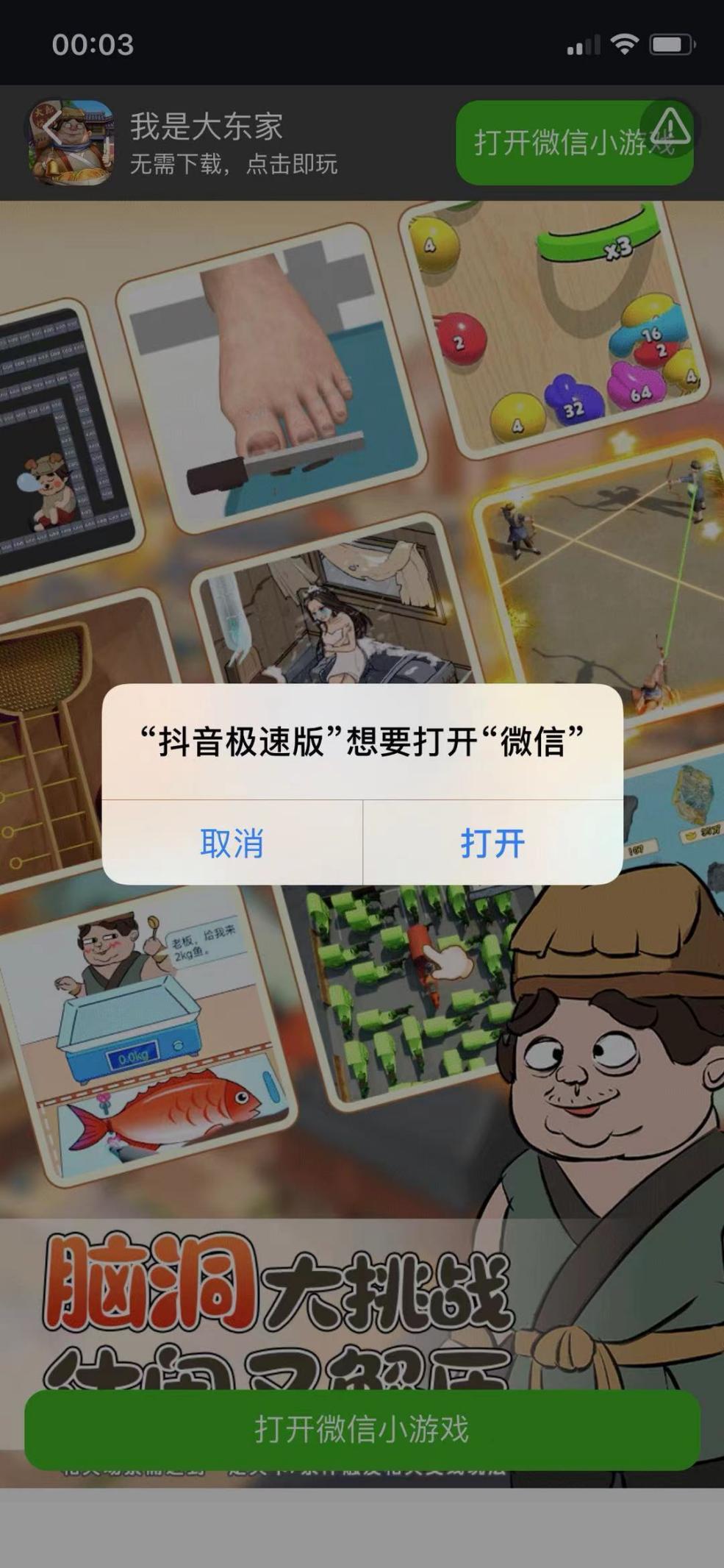 现在,很多微信小游戏也在抖音进行推广,抖音可以直接搜索并跳转的这类微信小游戏包括《叫我大掌柜》《我是大东家》《英雄盟约》《山海经异变》《异兽擎天》《别惹三国》《雄霸乱世》等。这种小游戏相对重度游戏来说是碎片化的,用户能在较短的时间内体验到打游戏的爽感,因此,小程序游戏同短视频一样具有解压、节奏快速、操作简单等特性,这与短视频内容属性适配度极高。作为竞争对手的微信来抖音买量,不论抖音小游戏发展如何,其游戏内容生态的价值已经被重视,而对字节来说游戏梦也许有了新的着力点。