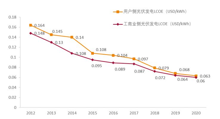 图:2012-2020光伏发电度电成本下降趋势,来源:天风证券