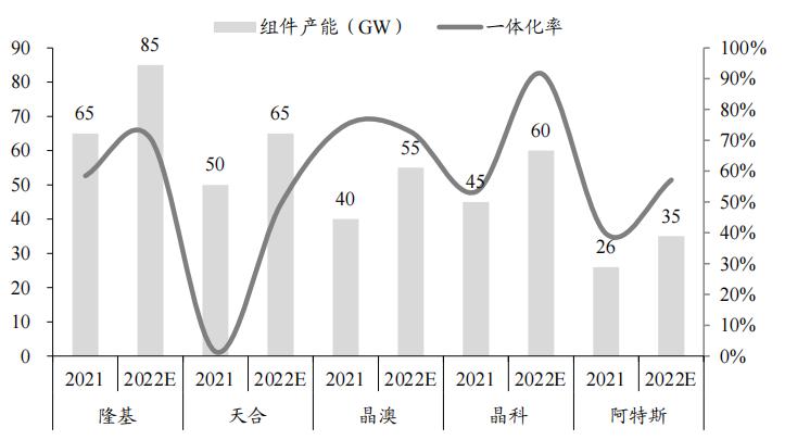 图:组件龙头组件产能及一体化率对比(GW,%),来源:CPIA,东吴证券研究所