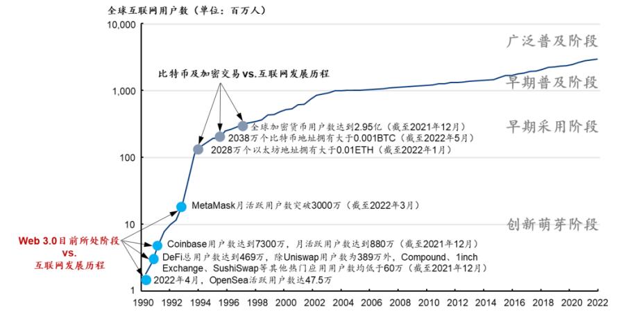 Web 3.0 目前所处阶段以及比特币和加密交易同互联网发展历程的比较,图片来源:华泰研究