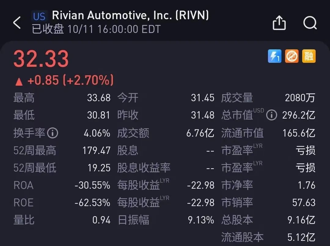 按照召回通知看,此次Rivian召回涉及约1.3万辆汽车,基本包括了其自去年底到目前售出的全部产品。受此召回事件影响,Rivian发布召回通知当日股价大跌超7%,最后收于33.95美元/股,相比于其上市当日的100.73美元/股,已经下跌了超66%。