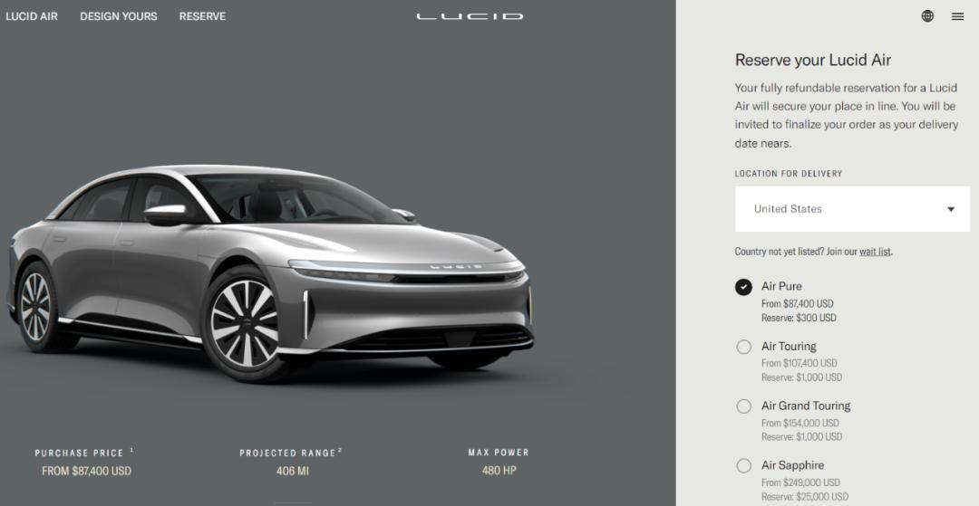 Lucid的销量表现会如此颓势,或许可以从其产品看出一些端倪。按照Lucid官网显示,其目前接受预定的产品有四款,分别为Air Pure、Air Touring、Air Sapphire和Air Grand Touring。