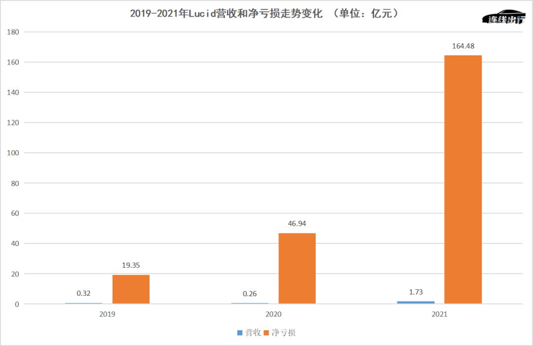 如此的困境在财报数据中也显露无疑。 根据Lucid公布的数据看,其2019-2021年营收方面分别实现为0.32亿元、0.26亿元和1.73亿元,但与此同时亏损也在连年扩大,分别为19.35亿元、46.94亿元和164.48亿元,三年亏损总计为230.77亿元。