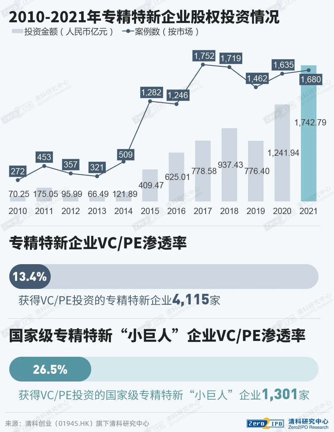 2010-2021年,我国“专精特新”企业的投资活跃度明显提升。2010-2021年间,国家向制造强国转型的步伐加快,伴随着政策层面对“专精特新”的支持力度增大,股权投资总金额也大幅增长。但股权投资机构在“专精特新”企业中的渗透率仍然不高,约为13.4%,更多优质企业有待投资机构挖掘。其中,国家级“专精特新”小巨人企业因专业程度更高、创新能力更强,行业地位更加突出,易获得投资机构的关注,投资渗透率也高于行业平均值,达到26.5%。