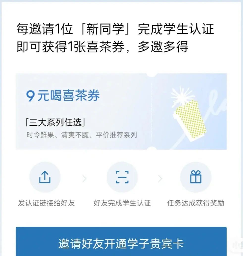 在活动中,持有学生卡的用户还可以邀请其他学生朋友参与认证,一旦认证成功,邀请和被邀请的两人都能再获得新的优惠券。