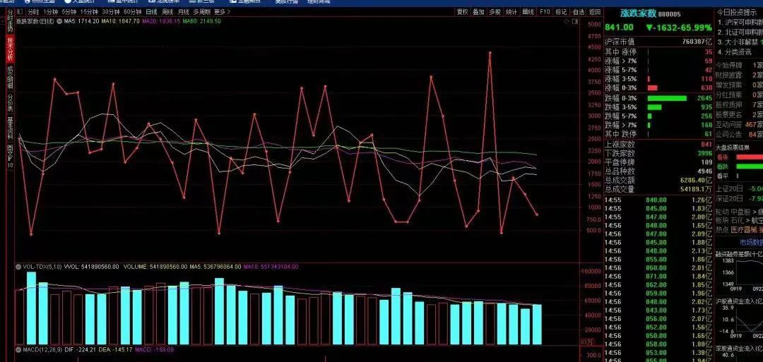 据Wind数据显示,两市共计有840家上涨,3996家下跌,108家平盘;成交量维持低位,全天成交只有6289亿元。