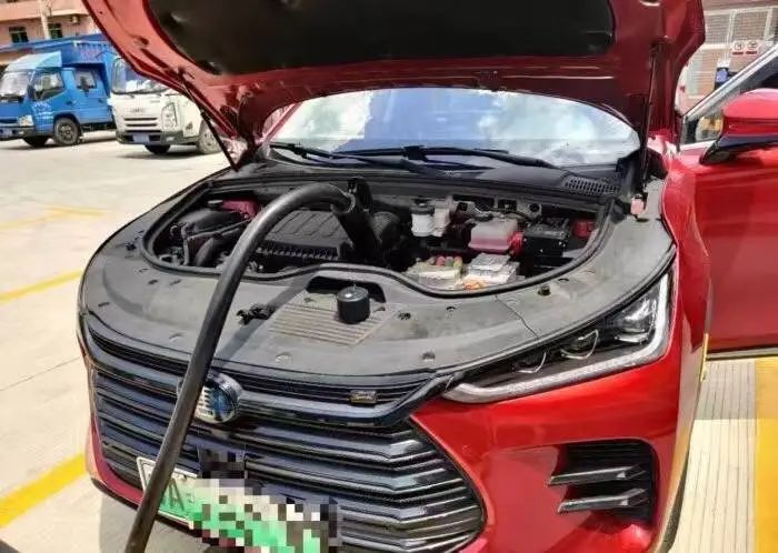 经过改装的车辆,在充电时比较特别,因为充电口是放在发动机舱里的,所以快充时要打开引擎盖才能插枪。