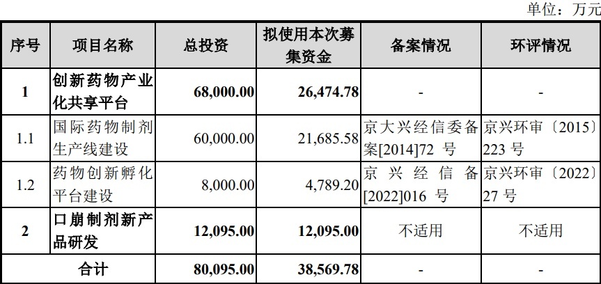 IPO募资方面,本次公司拟募资3.85亿元,资金将用于创新药物产业化共享平台、国际药物制剂生产线建设、药物创新孵化平台建设、口崩制剂新产品研发等项目。其中创新药物产业化共享平台建成投产后,公司能够高效、快速地将核心研发品种快速产业化,又能为一些创新型制药企业提供符合欧美标准的生产、研发、注册审批等服务,极大促进企业的自主研发能力和药物创新能力的发展。