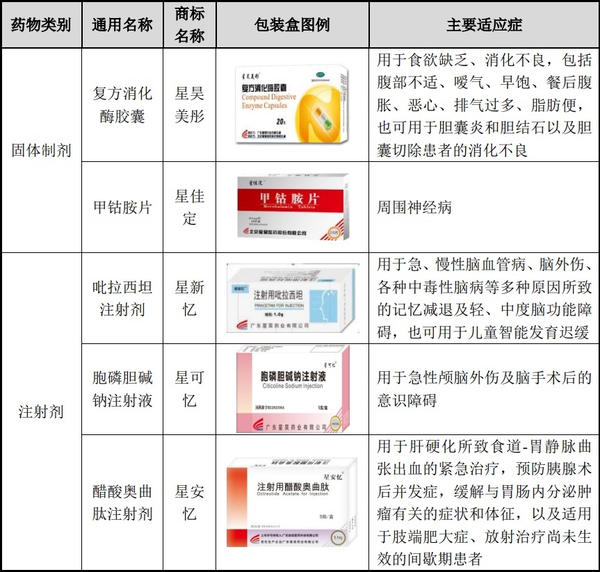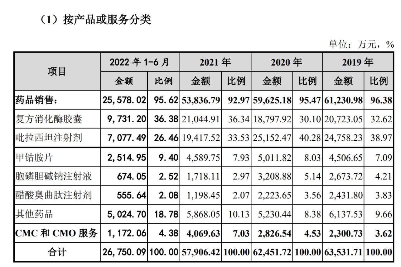 根据招股书显示,公司主营业务为复方消化酶胶囊(医保乙类)、吡拉西坦注射剂(医保乙类)、胞磷胆碱钠注射液(医保乙类)、甲钴胺片(医保乙类)等药物制剂,以及CMC/CMO公共服务平台。