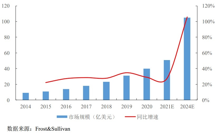 根据Frost&Sullivan数据显示,2014年我国CMO行业市场规模仅为9亿美元,随后快速上升至2020年的40亿美元,2024年预测约为105亿美元。从全球市占率来看,近年来我国CMO行业快速成长,从2014年的5.6%上升至2020年的 12.4%。