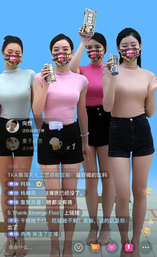 如果单纯从直播内容来看,其实多少能够感觉到椰树在进入直播领域时保持了一定的克制。无论是短视频里,穿着紧身衣的性感美女在摆满椰树产品的货架前,手拿产品舞动着身体,还是在直播间里,四位身穿紧身衣的美女主播在产品介绍和粉丝答谢之间穿插舞蹈才艺,椰树的内容都没有明显的暗示或者是违规的行为,但直播的结果却是被平台“秒掐”。