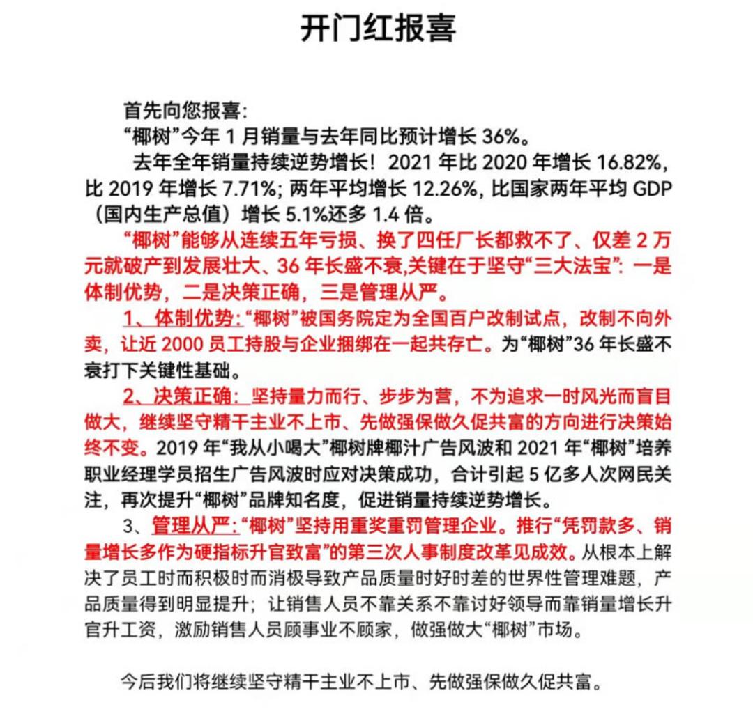 根据椰树集团的官网信息显示,2010年到2020年间,该集团连续十一年位列海口市工业企业产值第二名、税金第三名。2020年完成产值39.22亿元,上缴税金5.79亿元。另外,椰树集团在2022年公布的“开门红报喜”内容中还透露,其2021年的营收较2020年、2019年分别增长16.82%和7.71%,跑赢了同期中国GDP增速,2022年1月的销量更是同比增长36%。