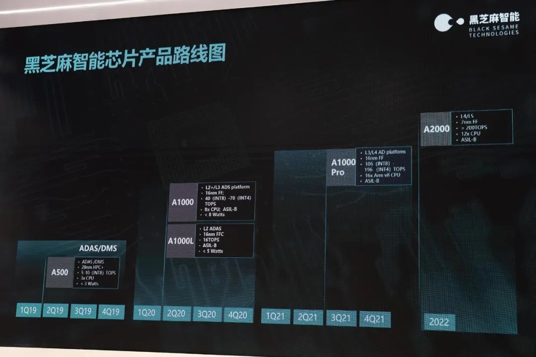第二代产品则与地平线征程3发布时间相近:2020年6月,黑芝麻智能发布华山二号A1000,算力在40-70TOPS,低配版A1000L在16TOPS。