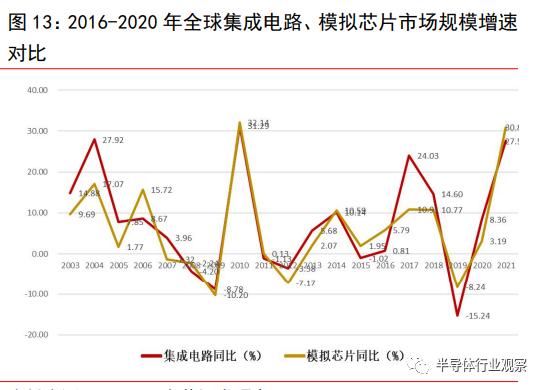 要说模拟芯片,无疑是这波缺芯潮中的大赢家,IC Insights 6月报告显示,从行业整体表现来看,2021年,模拟芯片市场增长了30%,高于集成电路市场的增幅(26%),每个通用和特定应用模拟产品细分市场都实现了两位数的销售增长。