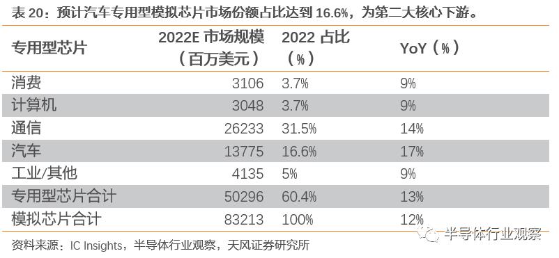 确实,在消费电子节节败退的当下,汽车似乎成为了芯片厂商的“拯救者”。对于模拟芯片来说,从车身、仪表、底盘,到动力总成及ADAS,其在汽车各个部分均有应用,并且在汽车领域的平均单机价值量高达200美元。汽车电子甚至已经成为了模拟芯片第二大下游应用场景,预计2022年专用型模拟芯片市场份额占比达到16.6%,市场规模同比增长17%。